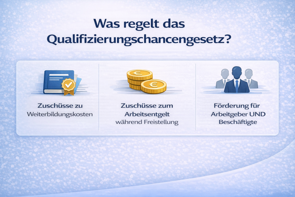 Das Qualifizierungschancengesetz ist ein zentrales Instrument der Arbeitsmarktpolitik, um Beschäftigte und Unternehmen bei der beruflichen Weiterbildung zu unterstützen. Ziel ist es, Mitarbeitende frühzeitig für neue Anforderungen zu qualifizieren, insbesondere im Zuge von Digitalisierung, Automatisierung und dem Einsatz von Künstlicher Intelligenz.